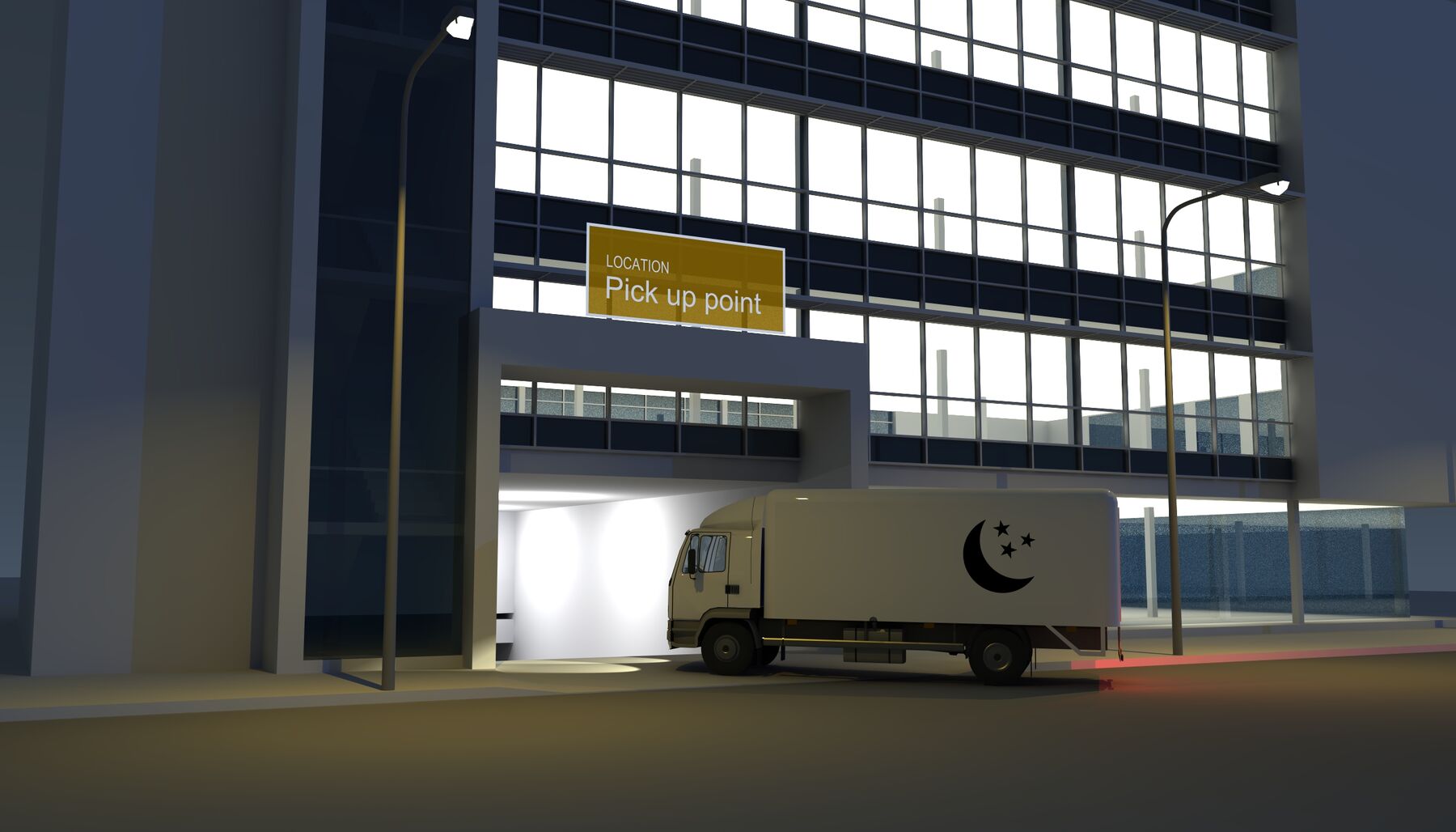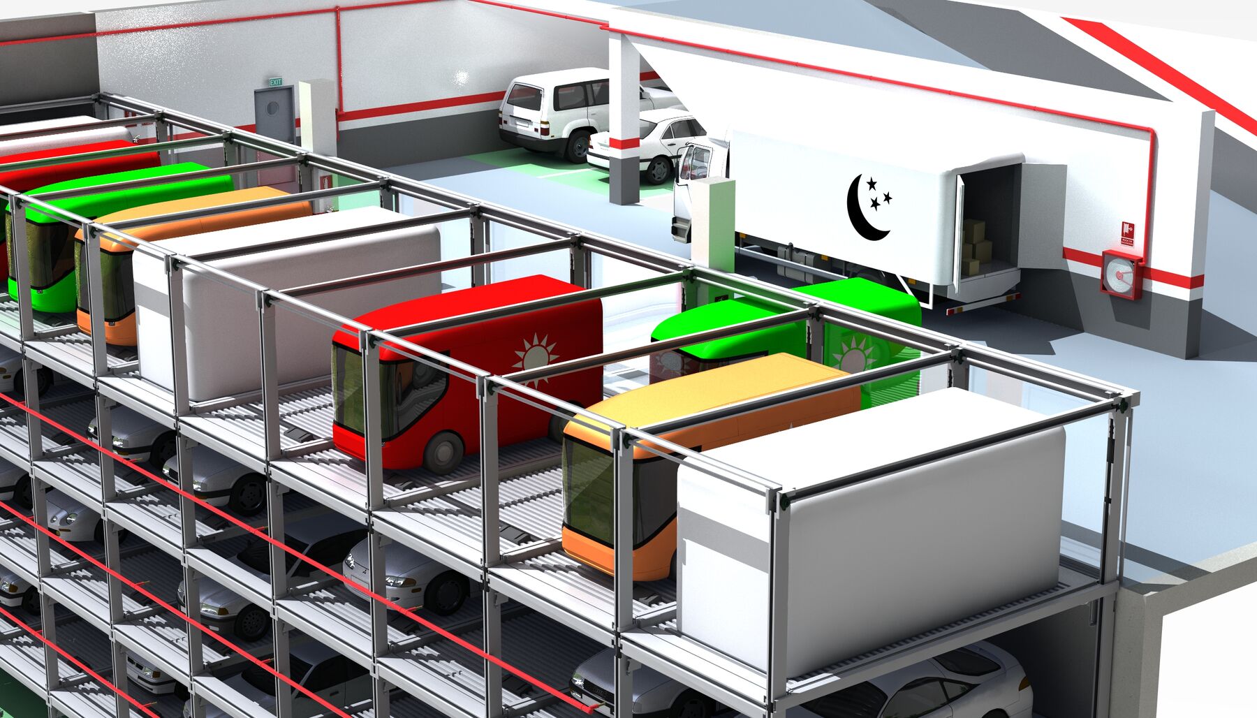 Nach der nächtlichen Anlieferung durch grosse LKWs erfolgt im Parksystem, welches als Logistikzentrum fungiert, das Umpacken der Waren auf kleinere Transportmittel wie Elektro-Transporter, Lastenräder oder andere umweltfreundliche Fahrzeuge. Diese sind bereits im System abgestellt und stehen bereit zur Beladung.