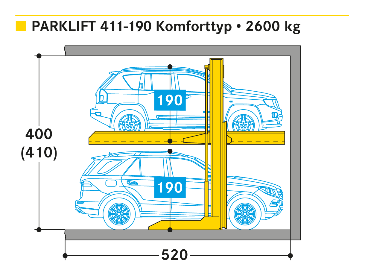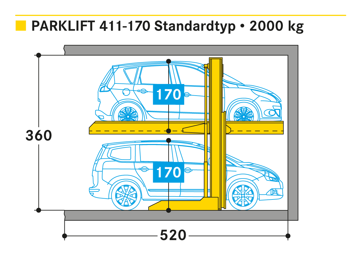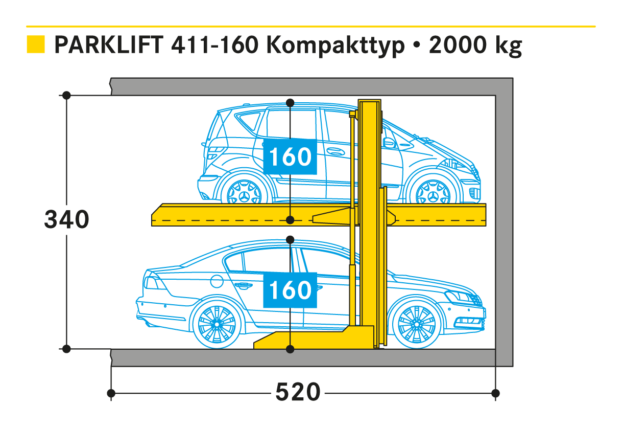 Abhängig heisst: der untere Stellplatz muss zur Nutzung des oberen Stellplatzes freigemacht werden. Mit einer geringen Zusatzausrüstung ist das Parksystem Parklift 411 auch im Freien aufstellbar. Die Einzelanlage für 2 Autos, die Doppelanlage für 4 Autos.