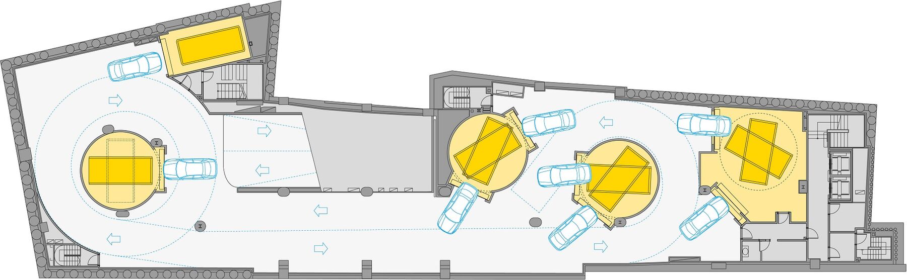 Im Gran Via Capital in Madrid befindet sich das innovativste automatische Parkhaus Spaniens mit 320 Stellplätzen von WÖHR. In der langen und sehr schmalen Gebäudekubatur, die eine Planung einer konventionellen Tiefgarage nicht zuliess, gelangt der Fahrer mittels einer cleveren Verkehrsführung zu einer der fünf komfortablen Übergabekabinen.