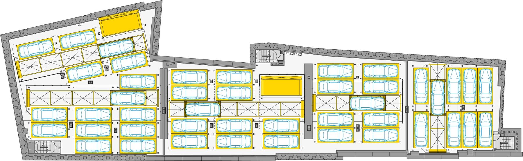 In der Übergabekabine steht immer eine leere Palette zur Verfügung. Am Bedienterminal wird das Einlagern bestätigt, die Tore schliessen, und das Auto wird automatisch in den unterirdischen Lagerbereich abgesenkt. Dort wartet bereits das Shuttlesystem mit einer leeren Palette. Die belegte Palette mit dem Auto wird simultan gegen die leere Palette gewechselt. Das Shuttlesystem des Parksafe 582/583 befördert nun das Auto sicher und zuverlässig in das vorgesehene Lagerfach. Zeitgleich transportiert der Vertikallift die leere Palette in die Übergabekabine, der nächste Einparkvorgang kann innerhalb kürzester Zeit erfolgen. Dank dieses Palettenschnellwechselsystems freuen sich die Nutzer über schnelle Zugriffszeiten.
