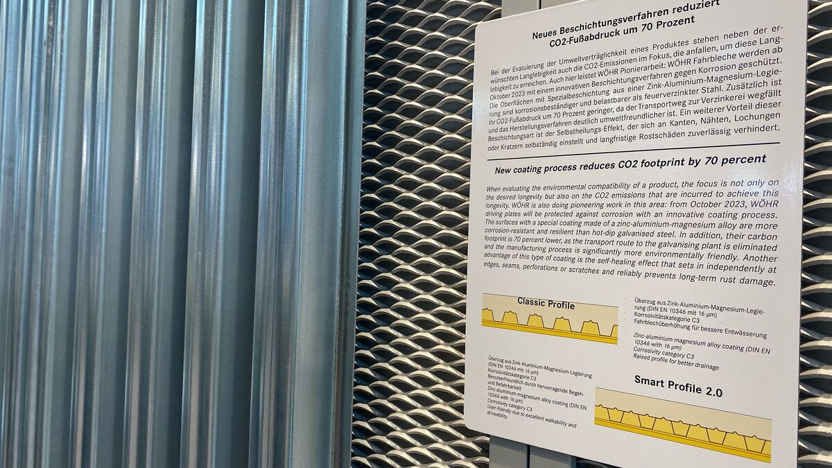 Die Oberflächen mit Spezialbeschichtung aus einer Zink-Aluminium-Magnesium-Legierung sind korrosionsbeständiger und belastbarer als feuerverzinkter Stahl. Zusätzlich ist ihr CO2-Fussabdruck um 70 Prozent geringer, da der Transportweg zur Verzinkerei wegfällt und das Herstellungsverfahren deutlich umweltfreundlicher ist. Ein weiterer Vorteil dieser Beschichtungsart ist der Selbstheilungs-Effekt, der sich an Kanten, Nähten, Lochungen oder Kratzern selbständig einstellt und langfristige Rostschäden zuverlässig verhindert.
