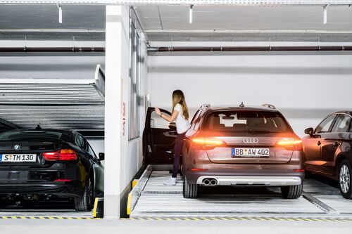 Le nouveau Parklift 405 arrive sur le marché avec les mêmes développements que le Parklift 450 et présente un avantage supplémentaire. Avec une hauteur de plafond encore plus basse, il est possible de garer les mêmes dimensions de véhicules que dans le Parklift 450. L'espace de stationnement inférieur est accessible en pente. Il s'agit d'une réaction aux dimensions croissantes des véhicules et à la diminution de l'espace. La plate-forme inférieure est praticable avec une pente de 14%. La plate-forme supérieure a une pente minimale de 2 %, qui sert à drainer l'espace de stationnement supérieur.