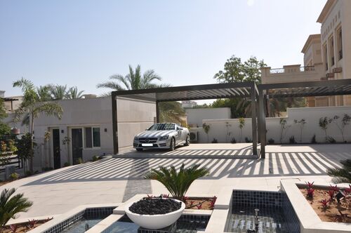 Un parking souterrain avec une protection solaire supplémentaire par le haut est une bonne idée dans la ville de Dubaï. D'avril à septembre, il y fait régulièrement plus de 40 degrés. Dans ce projet de construction, les abris pour voitures sur le site ont été placés à angle droit directement à côté du portail d'entrée de la villa. Ainsi, non seulement les résidents accèdent à la maison en quelques pas, mais les carports bénéficient également de l'ombre projetée par le bâtiment pendant plusieurs heures par jour. Les poteaux des carports reposent sur les plaques de couverture de deux élévateurs de parking WÖHR 461-2,6 D placés l'un à côté de l'autre. Ainsi, la petite cour peut accueillir jusqu'à huit véhicules. Afin de gérer en toute sécurité la charge supplémentaire des abris de voiture, la version de l'élévateur de parking avec une charge de plate-forme maximale de 2 600 kg a été choisie.