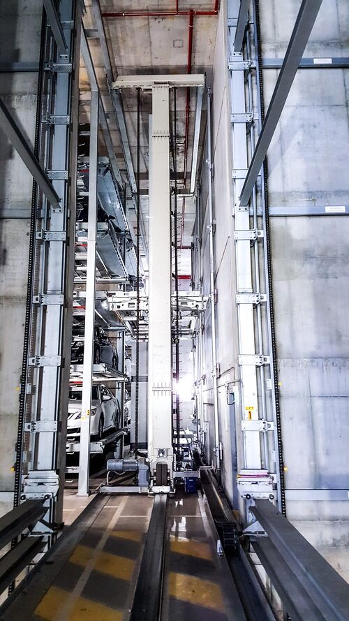 Outre les 52 niveaux d'habitation de la tour, le très efficace système de parking entièrement automatique est intégré dans une zone de base de neuf niveaux. Assorti au design ondulé de la façade, il présente une structure extérieure semi-transparente en forme de filet. À l'intérieur, le Multiparker 740 de WÖHR assure un stationnement peu encombrant en empilant les voitures les unes à côté des autres et les unes sur les autres dans le rayonnage haut. Dans une zone de stockage de 22 m de haut, 73 voitures d'une hauteur maximale de 160 cm sont automatiquement stockées sur six niveaux de parking, et 77 SUV d'une hauteur maximale de 200 cm sur cinq autres niveaux. L'entrée et la sortie du parking se font par deux zones de transfert indépendantes.