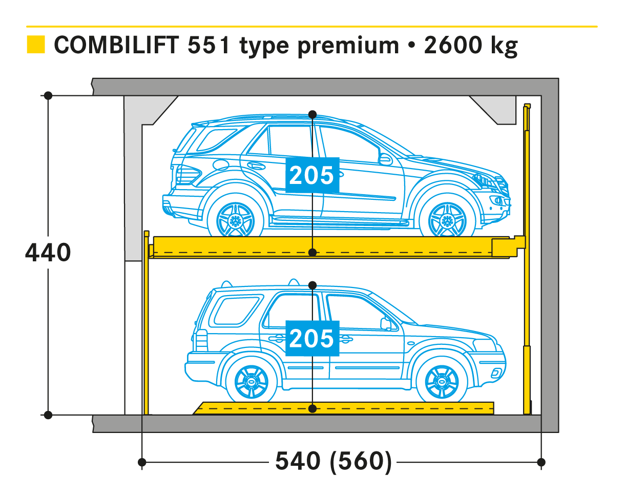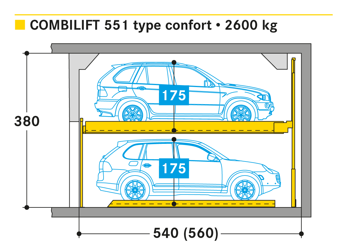 Le Combilift 551 permet un stationnement indépendant sur 2 niveaux de parking sans fosse. Grâce à la technique de casse-tête, toutes les places sont directement accessibles par le niveau d'entrée.