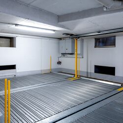 Grâce à des plate-formes coulissantes latéralment, plusieurs rangées de stationnement peuvent être disposées les unes derrière les autres. Cela permet de réduire la surface de circulation et d'utiliser l'espace mort derrière les piliers. Les plate-formes coulissent sur des rails et peuvent être disposées en 2 à 4 rangées de stationnement directement les unes derrière les autres. Une place vide dans chaque rangée de plateformes de stationnement libère le passage vers la place de stationnement sélectionnée.