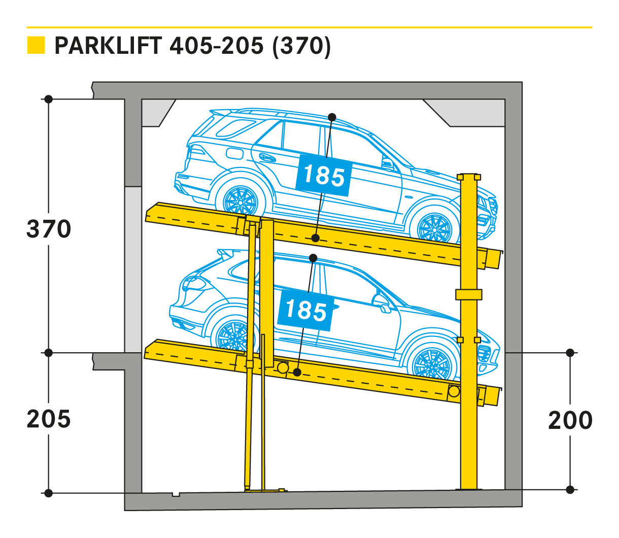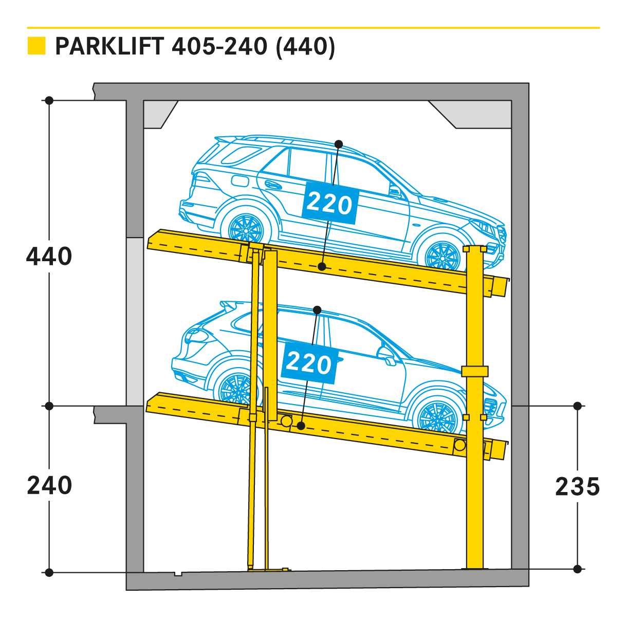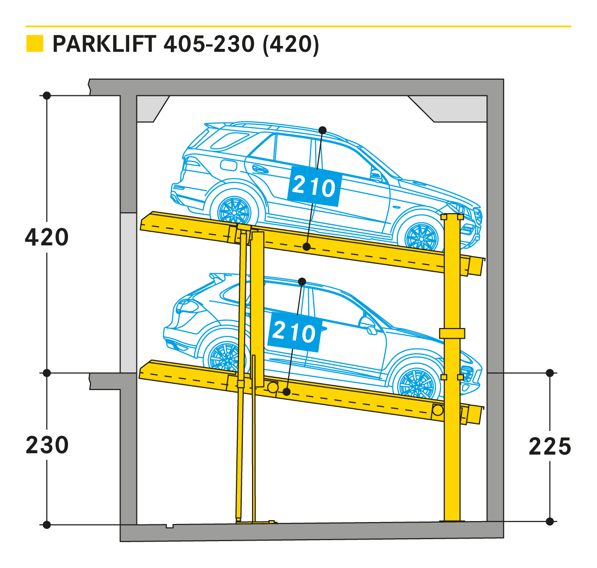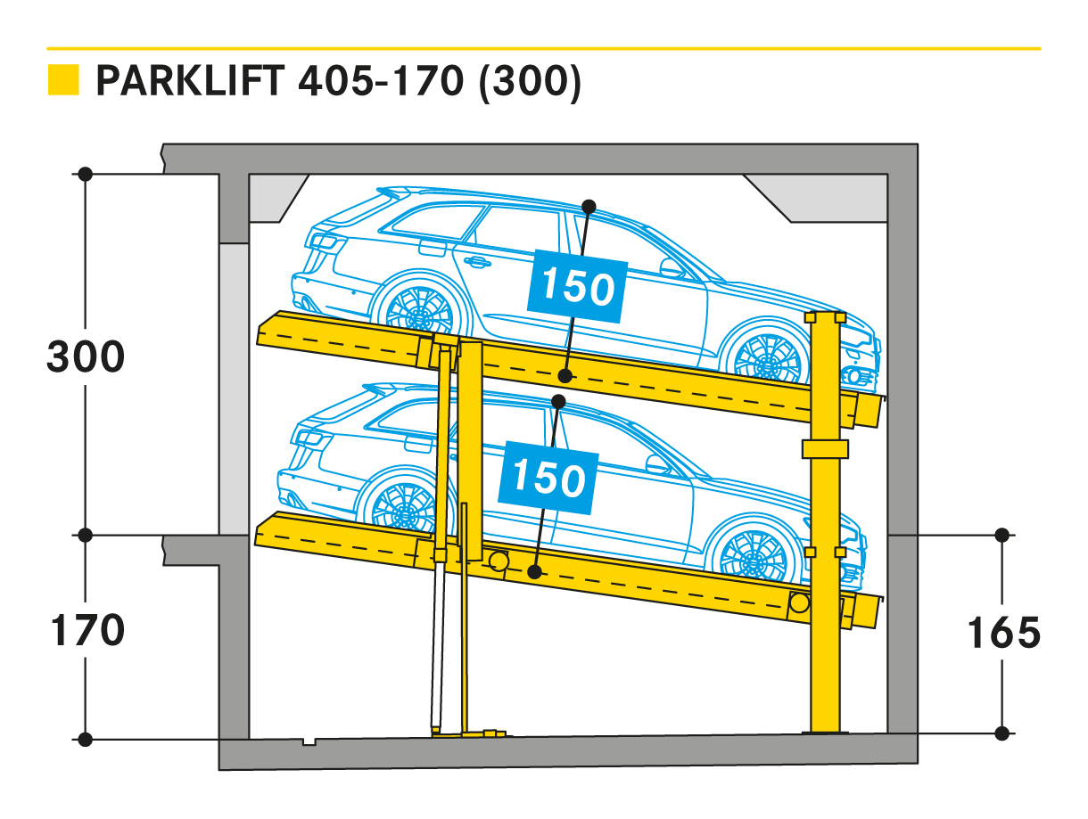 Le Parklift 405 arrive sur le marché en présentant les mêmes développements que le Parklift 450 et se distingue, de surcroît, par un autre atout. Il peut abriter les véhicules ayant les mêmes dimensions que celles du Parklift 450 avec une hauteur sous plafond encore plus réduite, la place de stationnement inférieure étant accessible en position inclinée. C’est la réaction aux dimensions toujours croissantes des voitures et aux espaces de stationnement de plus en plus réduits. La plateforme inférieure est accessible en position inclinée de 14%. La plateforme supérieure a une inclinaison minimale de 2% facilitant l’écoulement des eaux de la place de stationnement supérieure. L’installation simple est conçue pour 2 voitures, l’installation double pour 4 voitures.