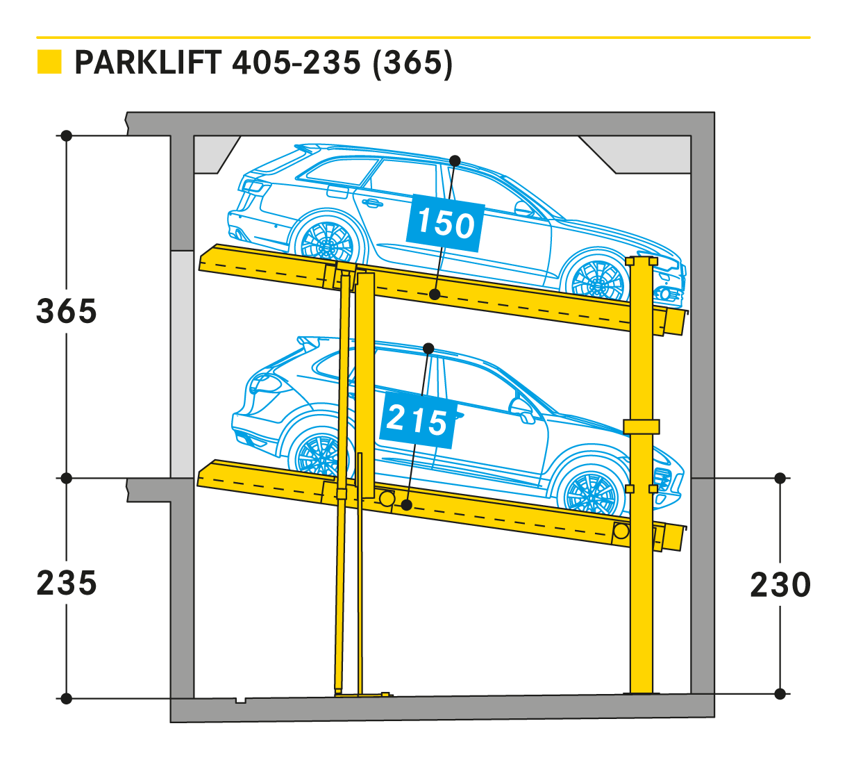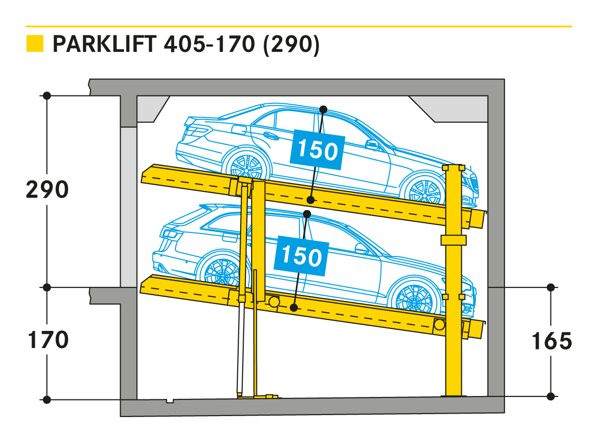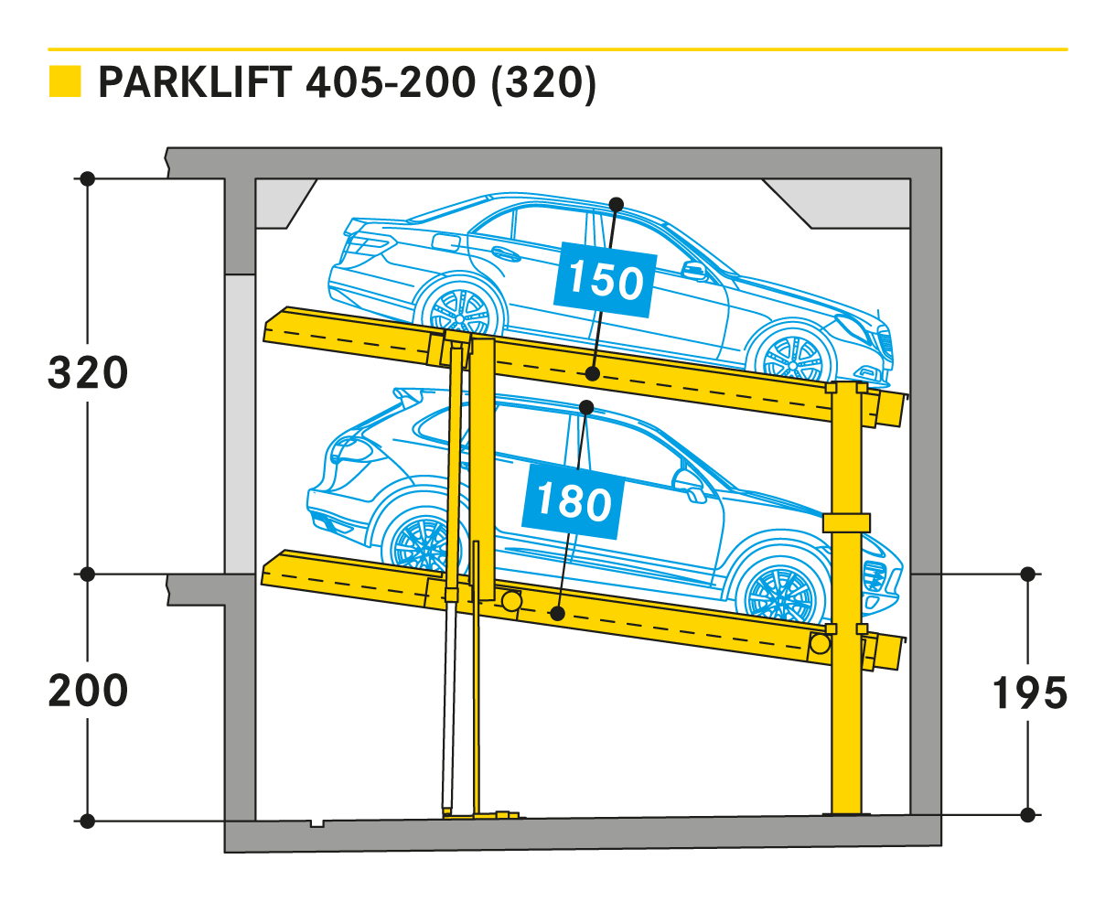 Le Parklift 405 arrive sur le marché en présentant les mêmes développements que le Parklift 450 et se distingue, de surcroît, par un autre atout. Il peut abriter les véhicules ayant les mêmes dimensions que celles du Parklift 450 avec une hauteur sous plafond encore plus réduite, la place de stationnement inférieure étant accessible en position inclinée. C’est la réaction aux dimensions toujours croissantes des voitures et aux espaces de stationnement de plus en plus réduits. La plateforme inférieure est accessible en position inclinée de 14%. La plateforme supérieure a une inclinaison minimale de 2% facilitant l’écoulement des eaux de la place de stationnement supérieure. L’installation simple est conçue pour 2 voitures, l’installation double pour 4 voitures.