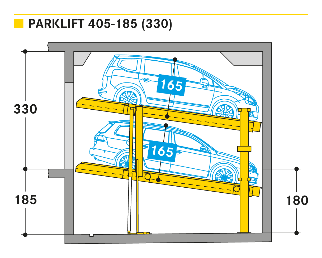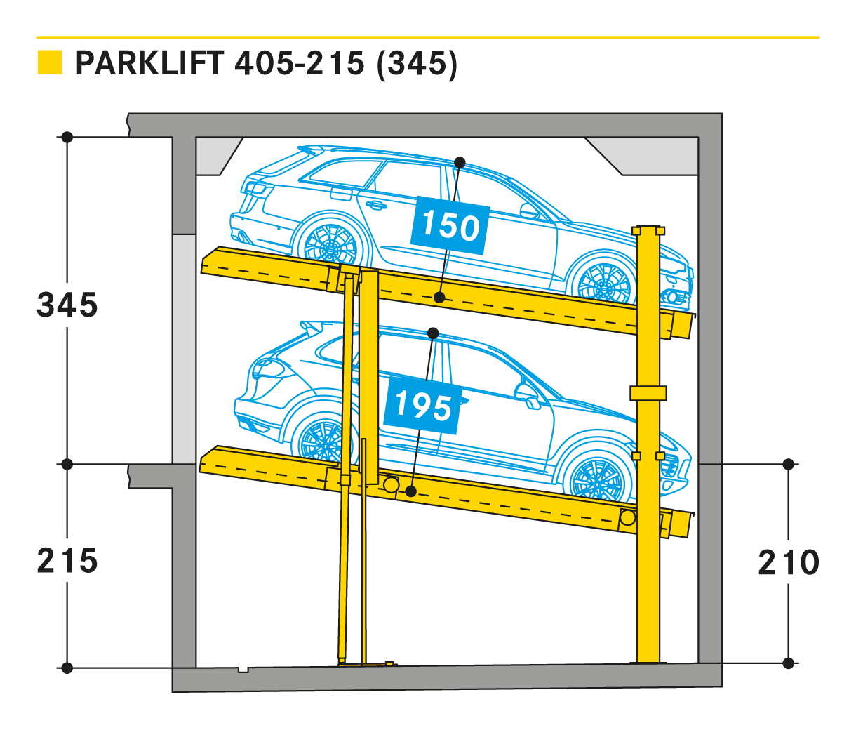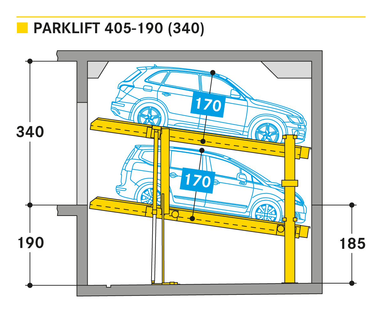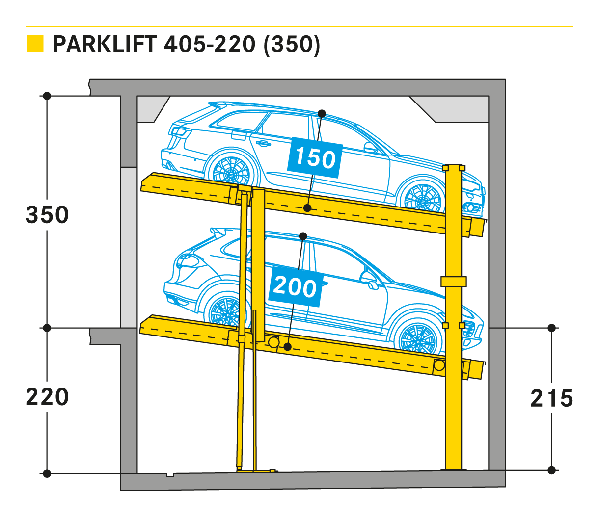 Le Parklift 405 arrive sur le marché en présentant les mêmes développements que le Parklift 450 et se distingue, de surcroît, par un autre atout. Il peut abriter les véhicules ayant les mêmes dimensions que celles du Parklift 450 avec une hauteur sous plafond encore plus réduite, la place de stationnement inférieure étant accessible en position inclinée. C’est la réaction aux dimensions toujours croissantes des voitures et aux espaces de stationnement de plus en plus réduits. La plateforme inférieure est accessible en position inclinée de 14%. La plateforme supérieure a une inclinaison minimale de 2% facilitant l’écoulement des eaux de la place de stationnement supérieure. L’installation simple est conçue pour 2 voitures, l’installation double pour 4 voitures.