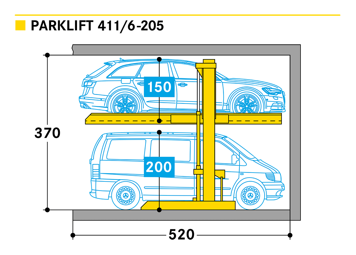 Dépendant signifie que la place inférieure doit être libérée pour permettre l'utilisation de la place supérieure. Avec un petit équipement supplémentaire, le Parklift 411 peut aussi être installé en extérieur. L'installation simple est conçue pour 2 véhicules.