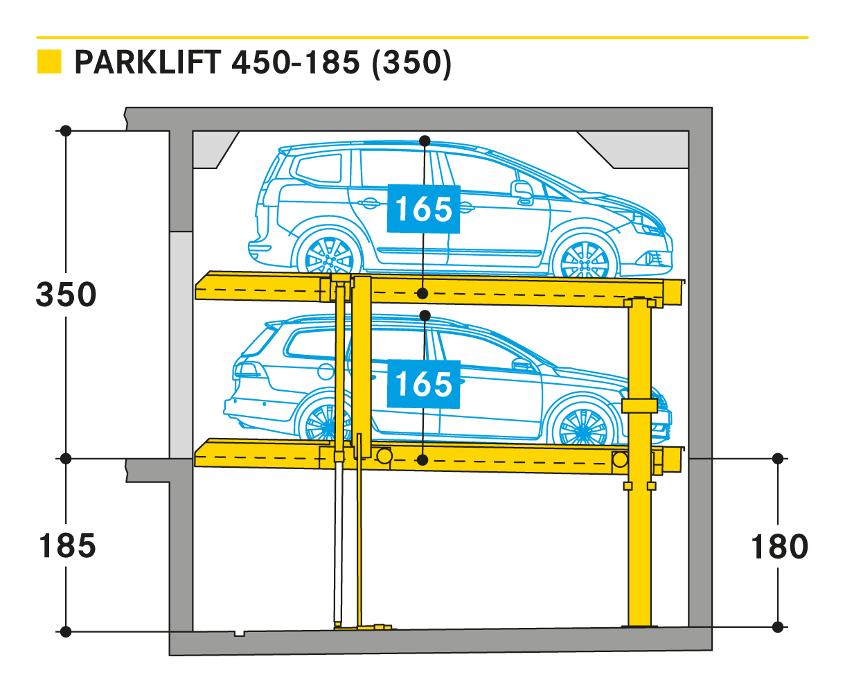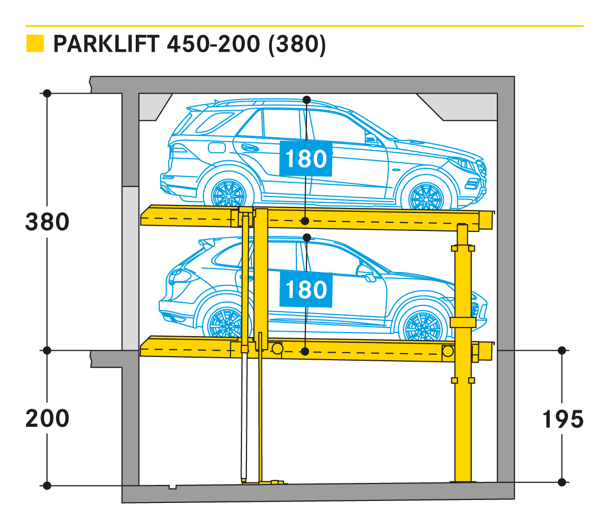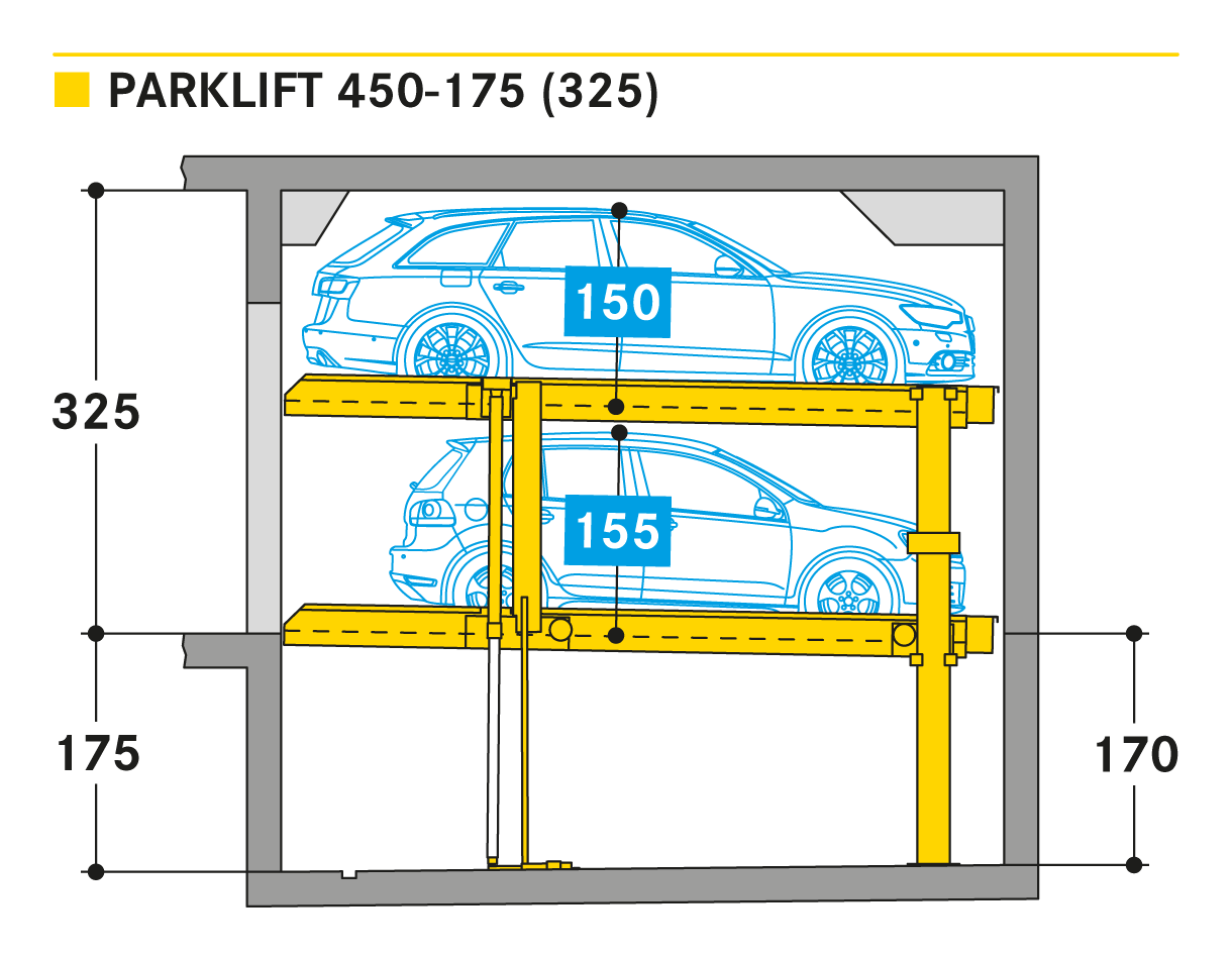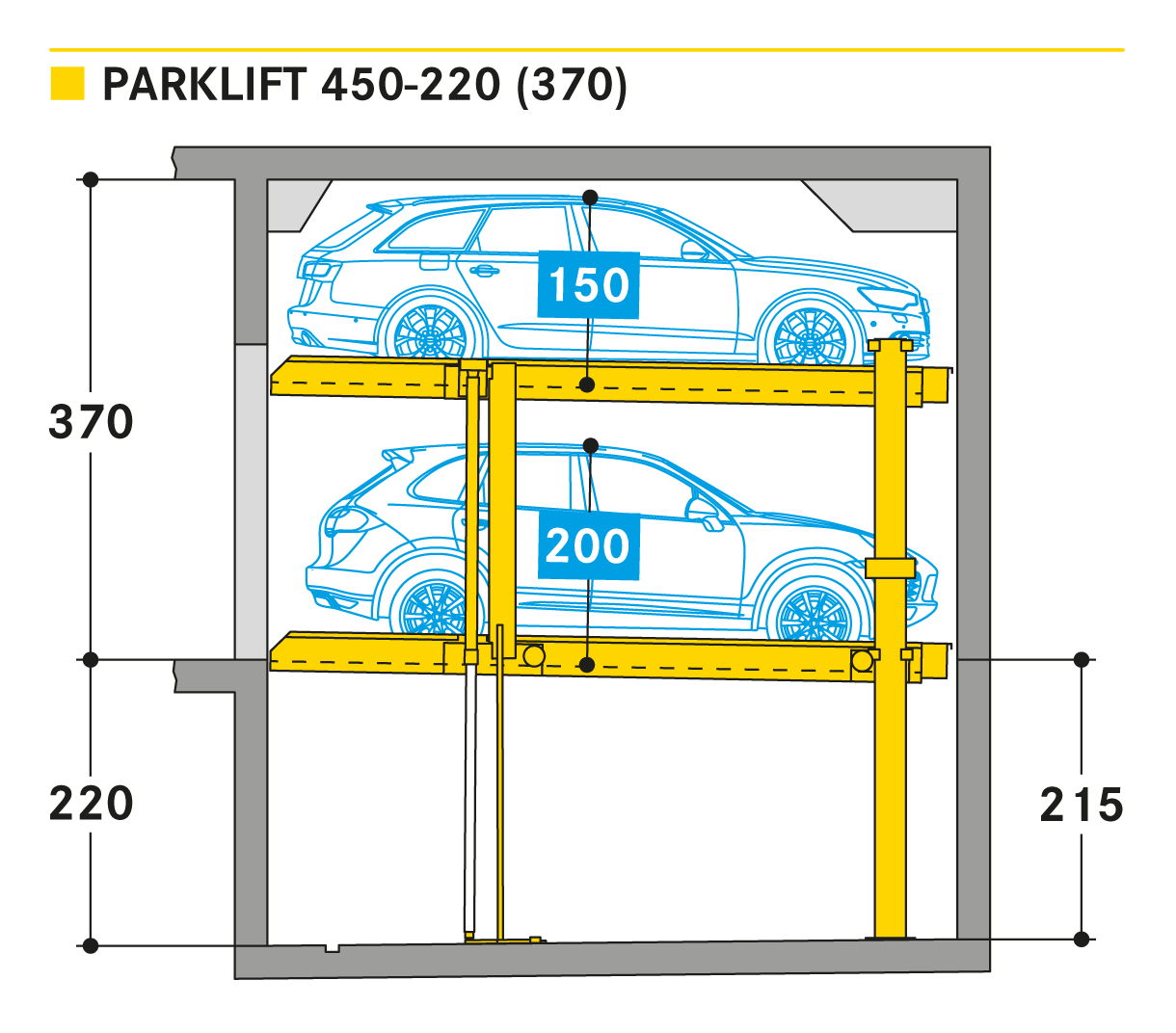 Le Parklift 450 se distingue par son extrême flexibilité en matière de cotes de montage. Nous laissons les intervalles rigides de 15 cm pour la profondeur de la fosse derrière nous et aspirons à plus de diversité. Les profondeurs des fosses de notre nouvelle conception varient à des intervalles de 5 cm. En comparaison avec le modèle précédent, il ne faut plus qu’une hauteur sous plafond de 5 cm de moins pour le Parklift 450 sans devoir pour autant réduire la hauteur des véhicules. Comment cela fonctionne-t-il? Le modèle précédent était équipé d’une plate-forme surélevée pour l’écoulement des eaux des places de stationnement dans le caniveau. Pour la nouvelle conception il n’est plus nécessaire de surélever la plate-forme et elle apporte la solution pour l’écoulement des eaux par une inclinaison minimale de la plate-forme de 2%. L’installation simple est conçue pour 2 voitures, l’installation double pour 4 voitures.