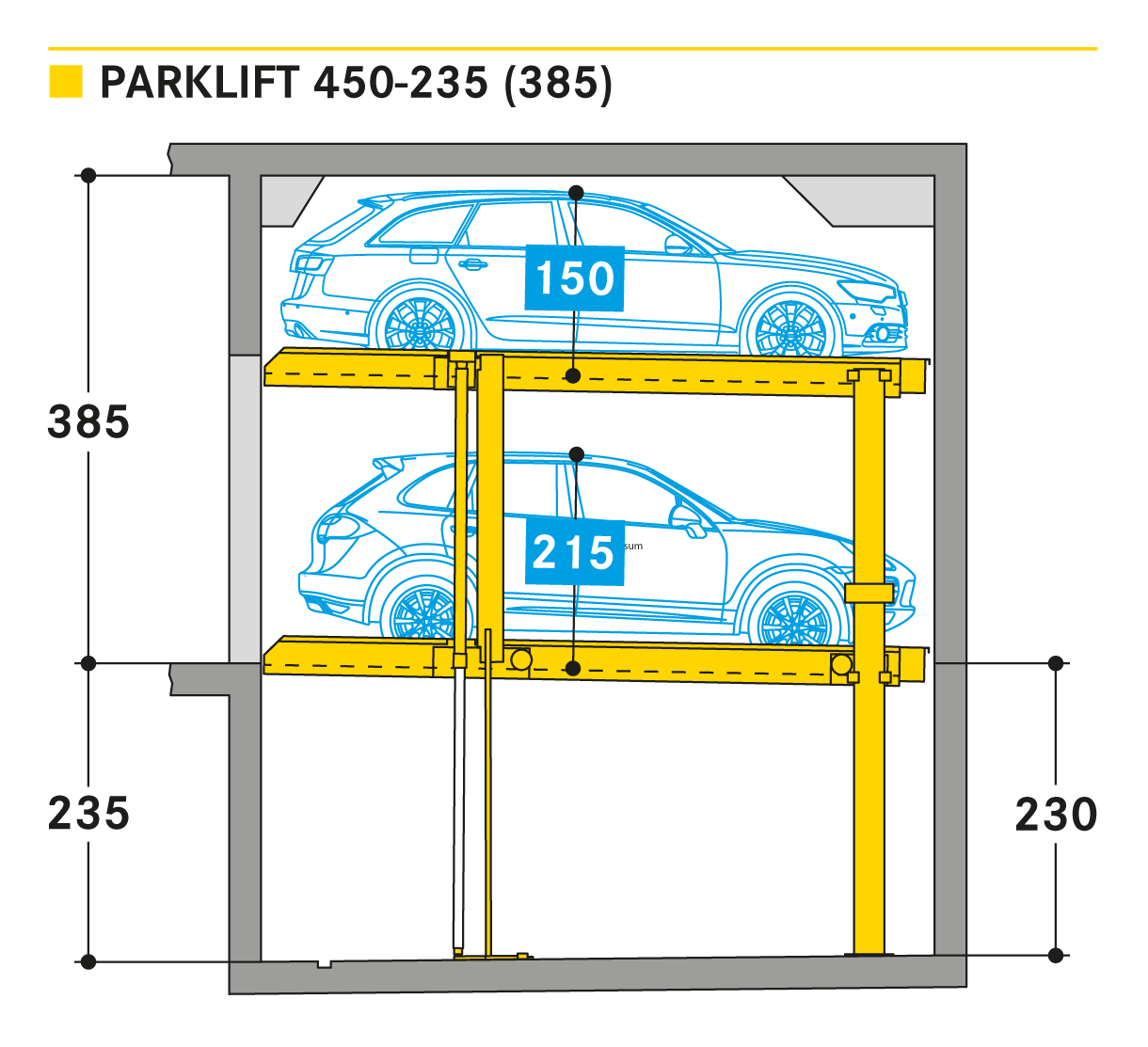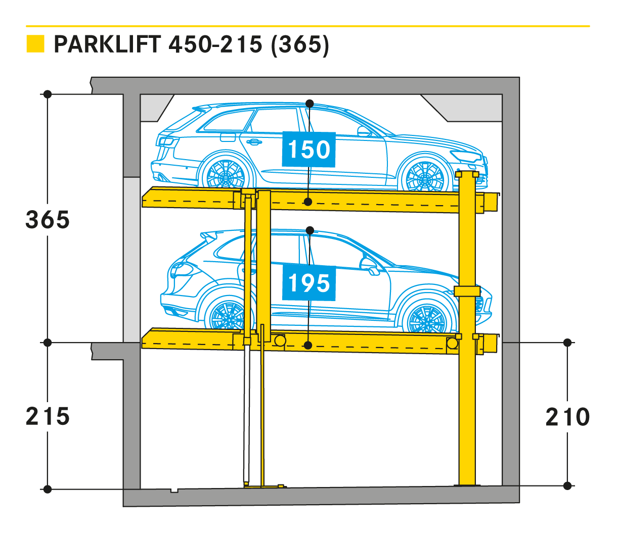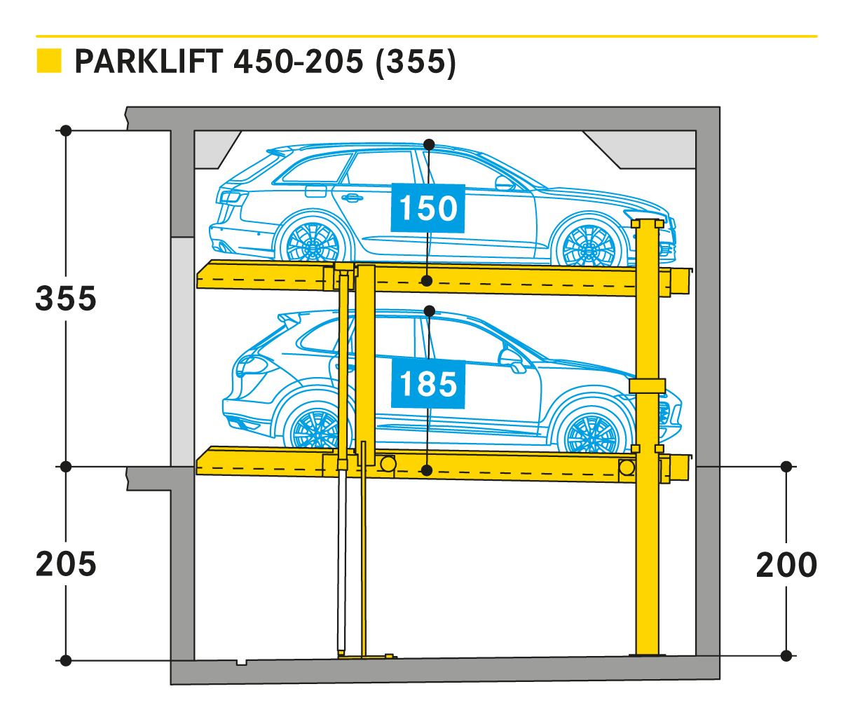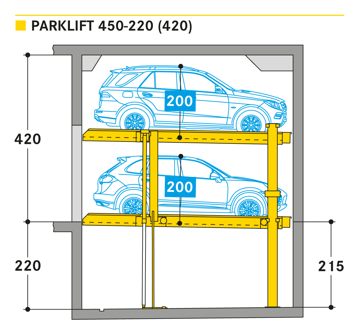 Le Parklift 450 se distingue par son extrême flexibilité en matière de cotes de montage. Nous laissons les intervalles rigides de 15 cm pour la profondeur de la fosse derrière nous et aspirons à plus de diversité. Les profondeurs des fosses de notre nouvelle conception varient à des intervalles de 5 cm. En comparaison avec le modèle précédent, il ne faut plus qu’une hauteur sous plafond de 5 cm de moins pour le Parklift 450 sans devoir pour autant réduire la hauteur des véhicules. Comment cela fonctionne-t-il? Le modèle précédent était équipé d’une plate-forme surélevée pour l’écoulement des eaux des places de stationnement dans le caniveau. Pour la nouvelle conception il n’est plus nécessaire de surélever la plate-forme et elle apporte la solution pour l’écoulement des eaux par une inclinaison minimale de la plate-forme de 2%. L’installation simple est conçue pour 2 voitures, l’installation double pour 4 voitures.