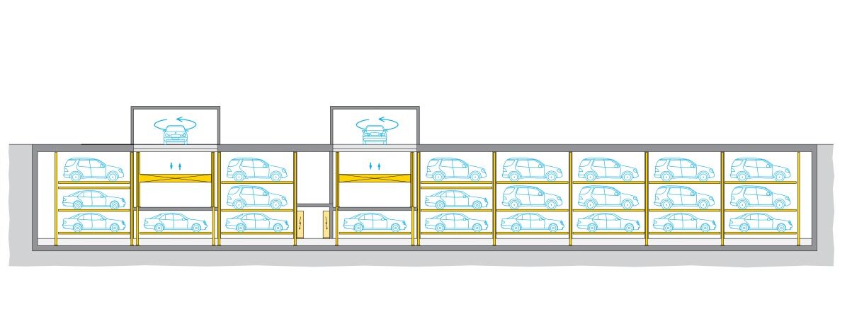 Une résidence de première classe doit aussi être pourvue de parkings de tout confort permettant un stationnement des véhicules rapide et en toute sécurité. Les architectes ont opté pour le système de parking automatique WÖHR Multiparker 740. Deux cabines d’entrée et de sortie assurent l’accès aux 98 emplacements de stationnement souterrains.