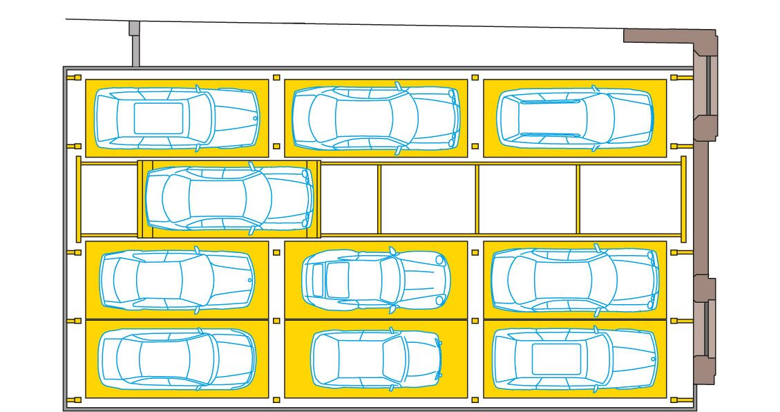 La tour de parking auto-porteuse à ossature métallique soutient le mur de la façade classée monument historique, du côté de la rue et de la sortie. 84 places de stationnement sont dissimulées derrière, pour les appartements et les bureaux réhabilités dans le bâtiment «Albany» construit à l'origine en 1858, dans le quartier des banques, non loin du port. Derrière la façade, les voitures sont garées automatiquement dans l'ossature métallique, sur des palettes réparties sur trois trames les unes derrière les autres et 10 niveaux superposés. En toute sécurité, comme dans un coffre-fort, 84 places de stationnement ont été logées rationnellement entre les bâtiments, dans une niche d'environ 10 m de large et 18 m de long. L'animation montre le fonctionnement du système.
