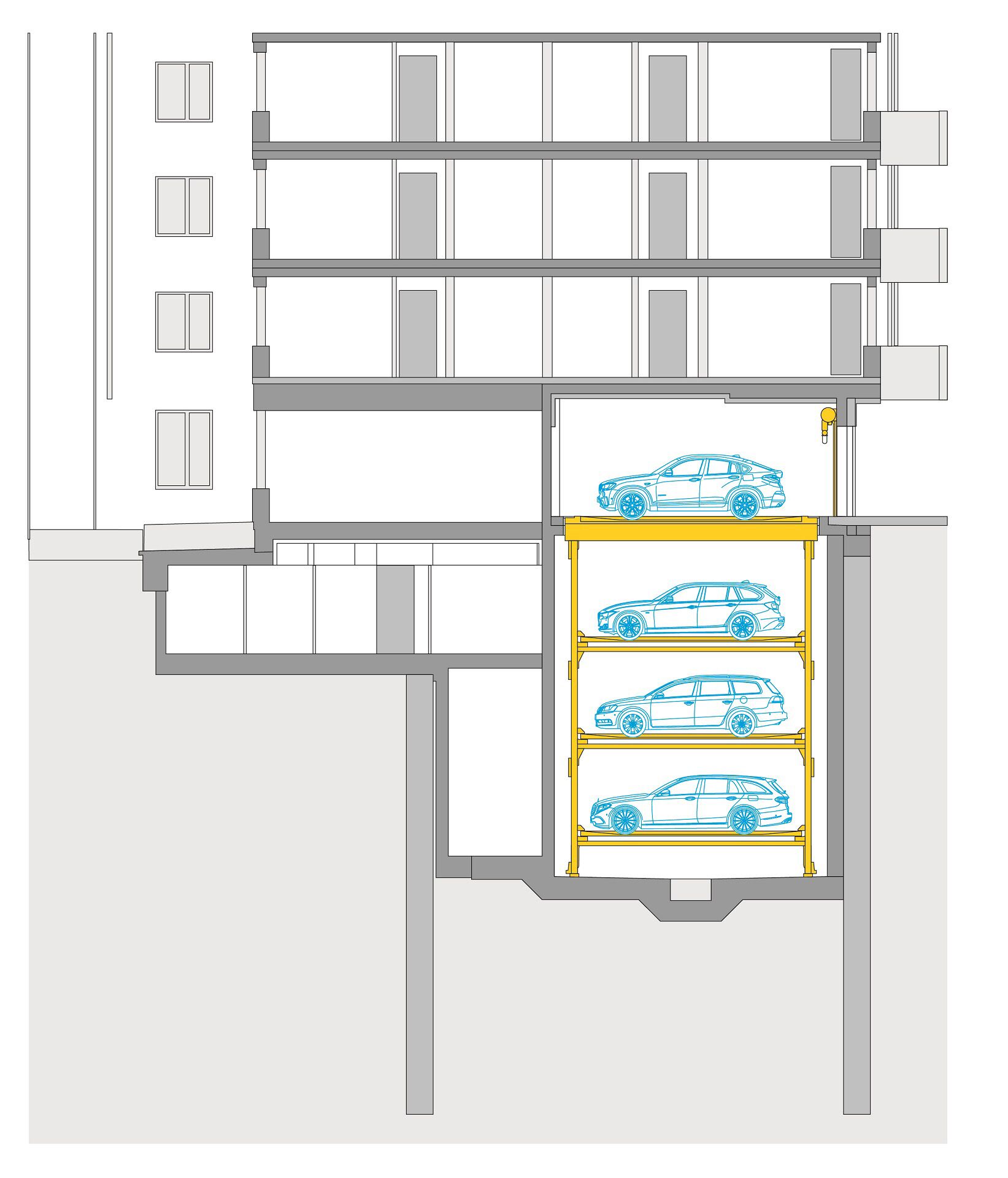 Système de parking entièrement automatique pour 36 véhicules: les habitants du nouvel immeuble de la Danklstrasse, Munich, se garent au Flurparker 590.
