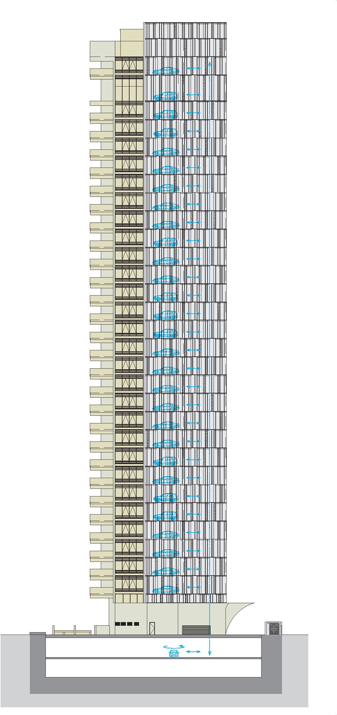 Avec le Multiparker 720 Wöhr, la Ferrari ou la Lamborghini est garée en douceur et en toute sécurité dans le Sky Garage à une hauteur de plus de 100 m. Pendant que l’ascenseur achemine confortablement les propriétaires vers leur appartement, le Multiparker transporte leur voiture avec rapidité et sûreté à l’un des 29 étages.