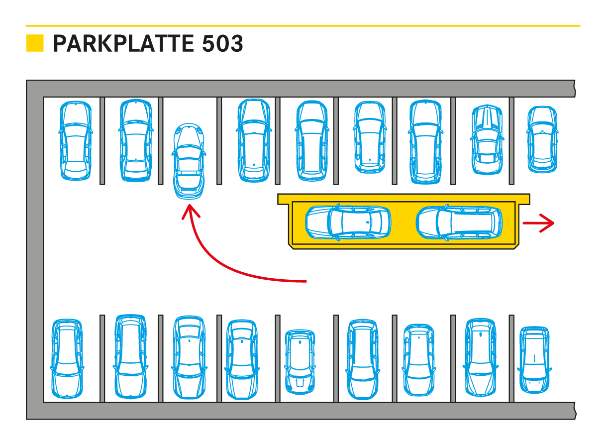 Utilizzando piattaforme a traslazione longitudinale si ottiene fino al 30% di posti auto in più. La piattaforma occupata viene spostata di lato tramite l’apposito pulsante sul dispositivo di comando centrale, le piattaforme libere sono oltrepassabili senza problemi.