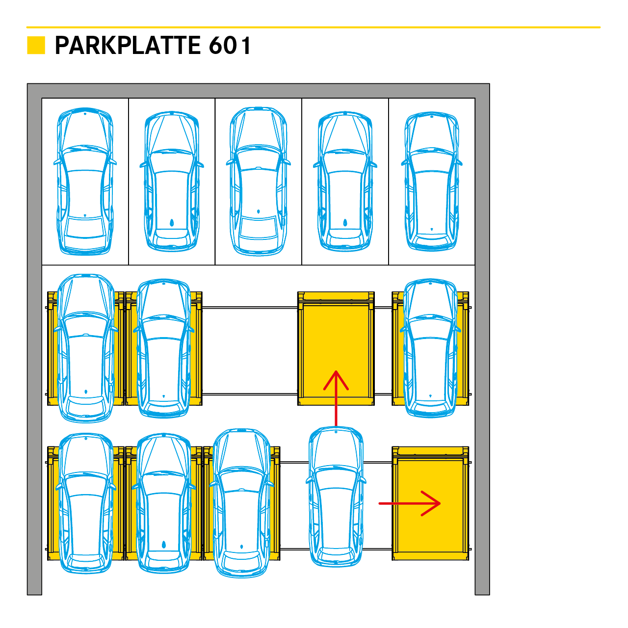 Grazie alle piattaforme trasversalmente scorrevoli, è possibile disporre più file di parcheggi una dietro l'altra. In questo modo è possibile ridurre la superficie di traffico e sfruttare lo spazio morto dietro i pilastri. Le piattaforme scorrono su binari e possono essere disposte in 2-4 file di parcheggi direttamente una dietro l'altra. Uno spazio vuoto in ogni fila di piattaforme di parcheggio libera il passaggio verso il posto auto selezionato.