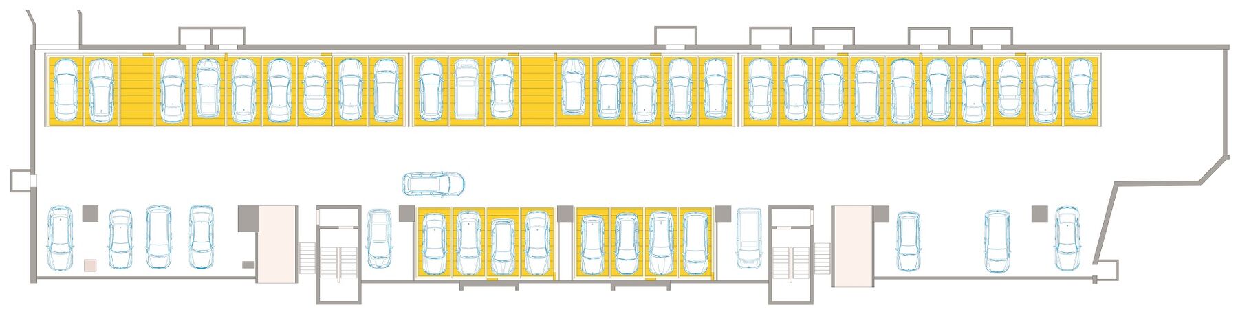 È merito di Martin Jasper se le dimensioni dell'edificio sono state elaborate in modo tale da renderlo un edificio attraente e integrato nello spazio urbano. Il modello di progetto dell'architetto nato a Buenos Aires mostra già l'approccio previsto: Invece di costruire un cortile interno, Jasper taglia il cubo a diverse profondità su tutti e quattro i lati, portando così la luce nei piani molto alti della struttura profonda 5,40 metri. I tagli, chiamati "vuoti" o "canyon", sono dotati di terrazze scalate che movimentano la facciata. Due piani scalati sovrapposti all'edificio esistente compensano lo spazio perso. Su richiesta del cliente SIGNA, Jasper ha infine realizzato il progetto insieme al secondo classificato, lo studio berlinese Gewers Pudewill, che si è occupato anche della progettazione generale. Tuttavia, ciò che sembra così semplice - ritagliare, sovrapporre e dotare di una facciata trasparente - si è rivelato più difficile del previsto. Soprattutto la stabilità da garantire durante i lavori di demolizione ha rappresentato una sfida che gli ingegneri strutturali di Bollinger und Grohmann sono riusciti a superare, tra l'altro, con l'aiuto di moderni rinforzi adesivi. Un nuovo quinto nucleo di accesso, situato in posizione centrale, consente di migliorare l'accesso ai piani. Le colonne in calcestruzzo a vista inclinate lungo i vuoti assicurano la stabilità dello stato finale, tracciano le forze prevalenti per tutti e ravvivano l'immagine dell'amplissima griglia di colonne di 12 metri per 12 metri. La griglia conferisce all'edificio un aspetto industriale che vive anche della ruvidità dello scheletro e delle tracce storiche in esso inscritte.