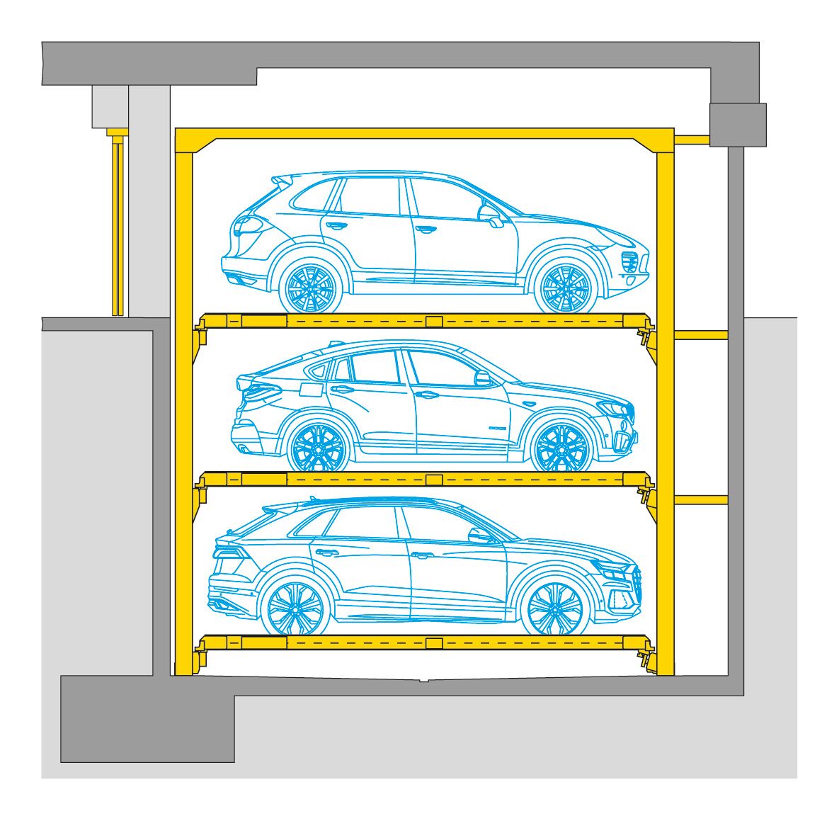 Il Combiparker 560 offre un concetto di parcheggio variabile con un massimo di cinque livelli di parcheggio, che offre una flessibilità senza pari grazie alla possibilità di costruire quattro livelli più in alto o quattro livelli più in basso rispetto al livello di ingresso. Con un'altezza standard del pavimento del parcheggio sotterraneo di 2,50 metri, questo sistema massimizza il risparmio di spazio consentendo di realizzare fino a quattro livelli sotto terra, rendendolo una delle soluzioni di parcheggio più versatili disponibili. Il Combiparker 560 può ospitare un'ampia gamma di dimensioni di veicoli e offre fino a 750 opzioni di layout. Inoltre, tutti gli stalli di parcheggio possono essere dotati di stazioni di ricarica per veicoli elettrici, a ulteriore sostegno delle iniziative sostenibili.