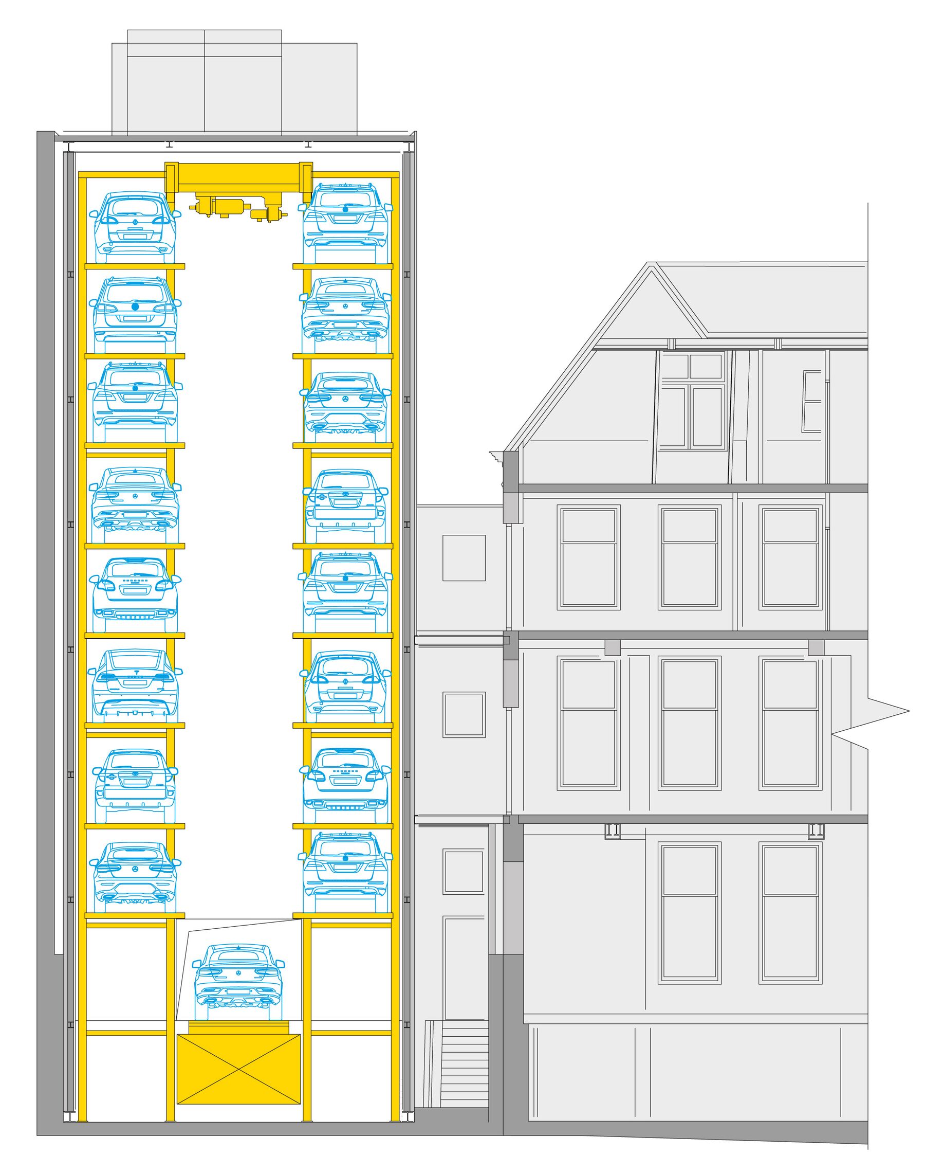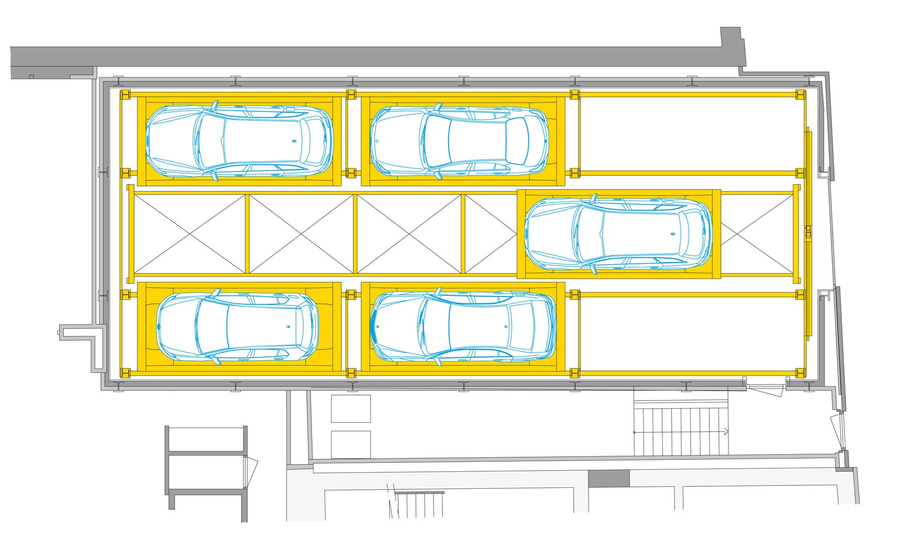 Oltre al mero scopo di conservazione storica, è palese in tutto l’edificio, e dunque anche nella soluzione di parcheggio da noi fornita, una minuziosa cura dei dettagli. Attraverso un’ampia vetrata dietro alla sua scrivania, il proprietario della costruzione può ammirare in qualsiasi momento il suo amato bolide tedesco, sempre parcheggiato nello stesso posto e messo in risalto da una scenografica illuminazione. Un progetto speciale per un committente speciale.