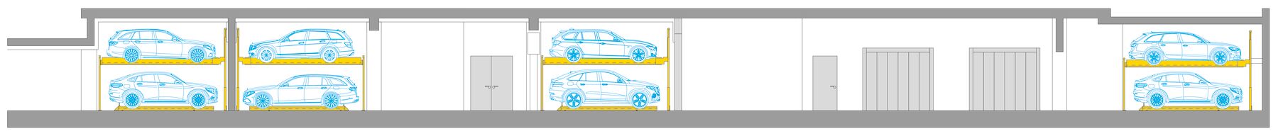 Al piano interrato è stato realizzato un comune garage sotterraneo con circa 100 posti auto, accessibile tramite due ascensori per auto. Tutti i posti auto sono dotati di infrastrutture di ricarica per veicoli elettrici. 50 posti auto sono stati disposti in modo compatto in quattro sistemi WÖHR Combilift 551 semiautomatici. Inoltre, sono disponibili aree per il car sharing. Il basso rapporto posti auto-abitazioni (0,4) e l’utilizzo dei sistemi WÖHR compatti contribuiscono alla strategia di mobilità sostenibile del quartiere e alla riduzione dei costi.