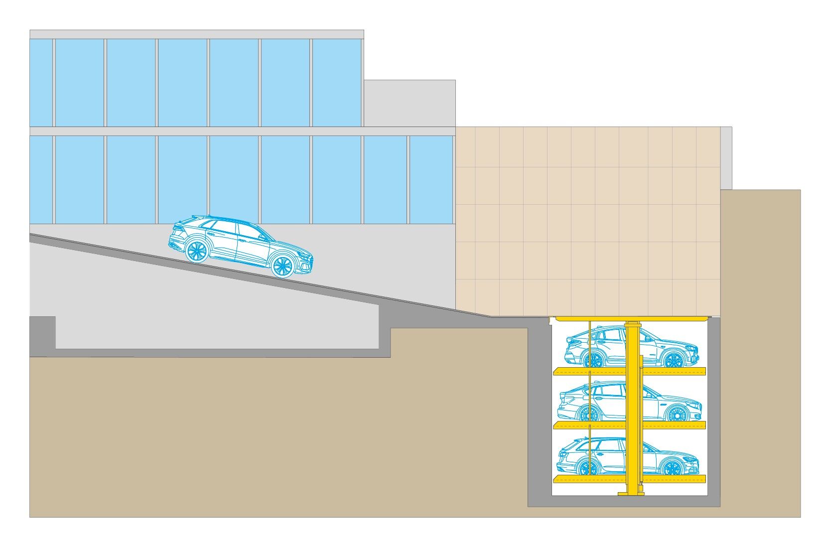 Quest'edificio è un ottimo esempio di costruzione efficiente dal punto di vista energetico e rispettoso dell'ambiente. La ventilazione e l'aria condizionata delle stanze, per esempio, sono fornite dall'energia geotermica e dall'energia solare termica. Anche una nuova soluzione di parcheggio a risparmio energetico e di spazio fa parte del concetto di ristrutturazione. A causa delle condizioni climatiche di Madrid, era necessaria una soluzione che funzionasse sottoterra e fosse integrate nel circuito di condizionamento dell'edificio. WÖHR è stata scelta come partner innovativo per questo compito impegnativo. Sono stati selezionati due ascensori di parcheggio doppi meccanici retrattili della serie 463-2.0 D con dodici posti auto su tre livelli e un singolo ascensore di parcheggio 462-2.3 E con due posti auto su due livelli. I livelli di parcheggio sono accessibili orizzontalmente.