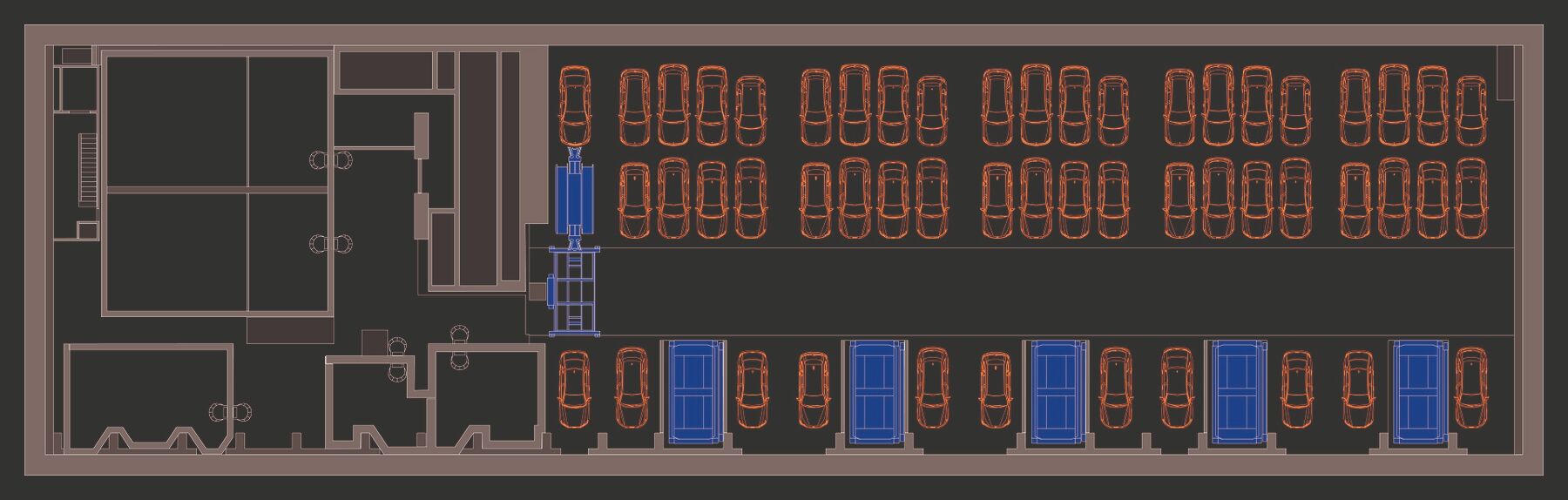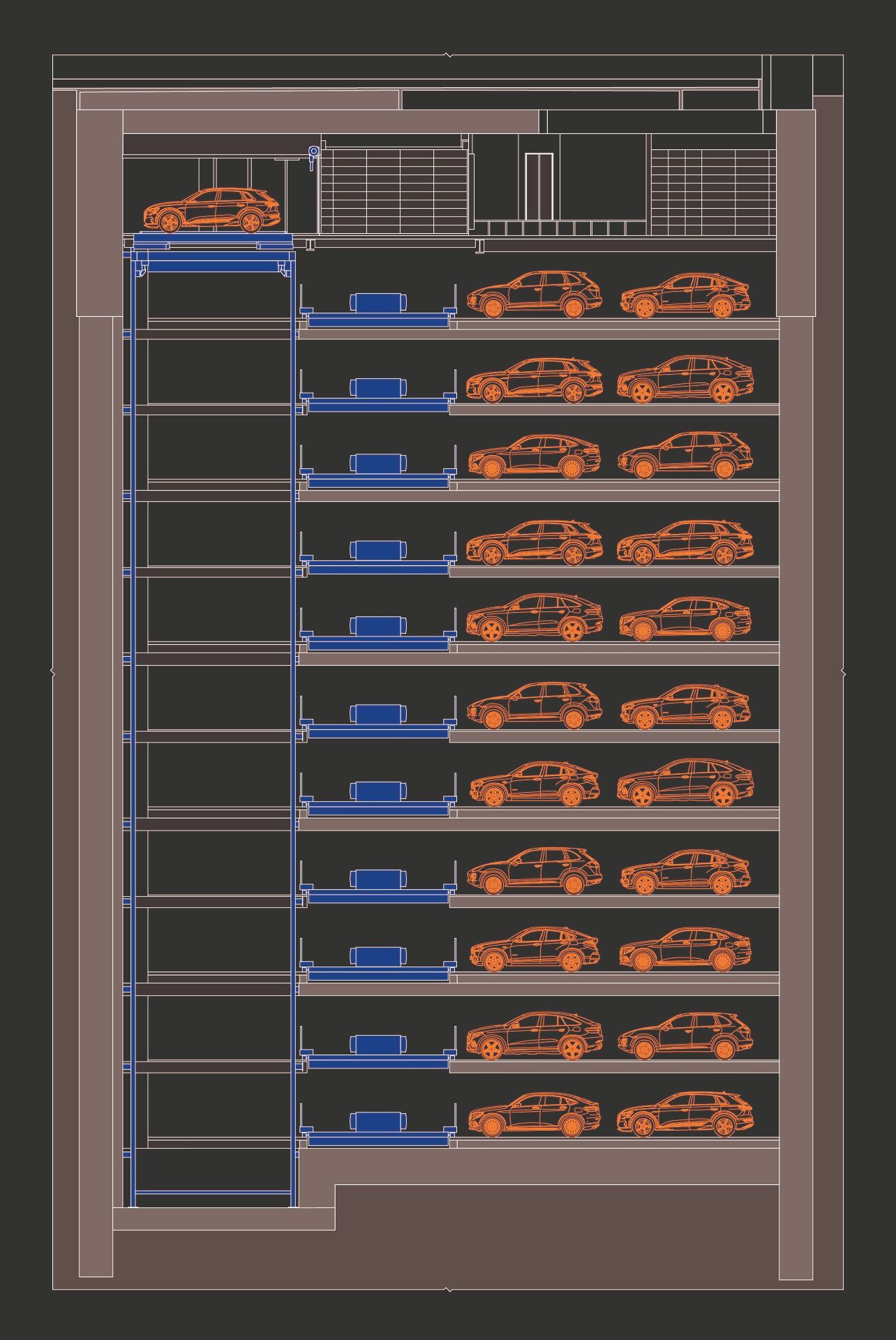 La piattaforma girevole manovra e trasporta l'auto dal primo a uno dei dodici livelli sotterranei dove viene parcheggiata. In 15 secondi, tutto è finito e la propria auto è in una specie di cassaforte che nessun altro può raggiungere.