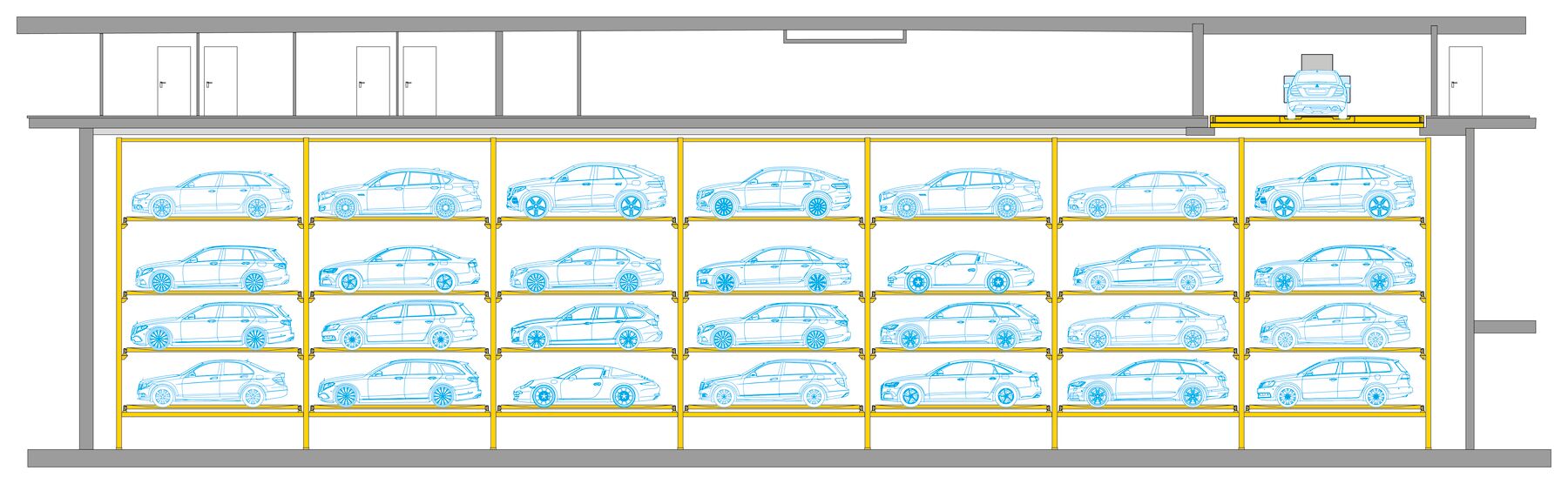 - 4 piani di parcheggio con 7 posti auto ciascuno
