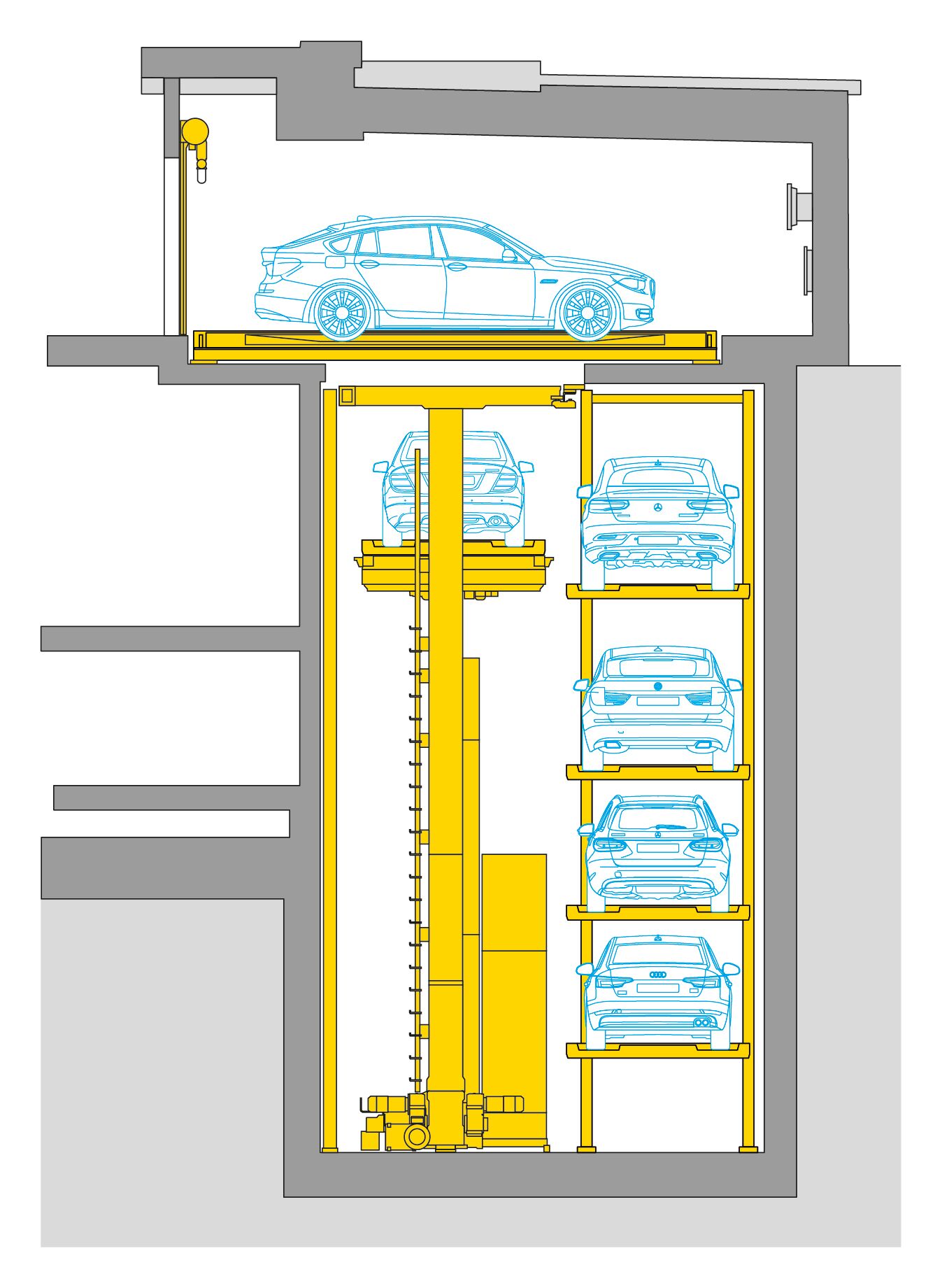 La situazione dei parcheggi ha rappresentato una sfida particolare, poiché il terreno era completamente edificato. La soluzione è stata trovata da WÖHR Autoparksysteme GmbH: il Multiparker 740 consente di parcheggiare in modo completamente automatizzato 28 veicoli su quattro livelli sotterranei, in modo efficiente e con il minimo ingombro.Gli utenti parcheggiano l’auto in un’area di consegna interna luminosa e moderna, a livello del terreno. Una piattaforma girevole integrata facilita l’entrata e l’uscita in direzione di marcia. L’auto viene trasportata su una piattaforma in un magazzino verticale sotterraneo, controllato da un dispositivo di comando con chip RFID.